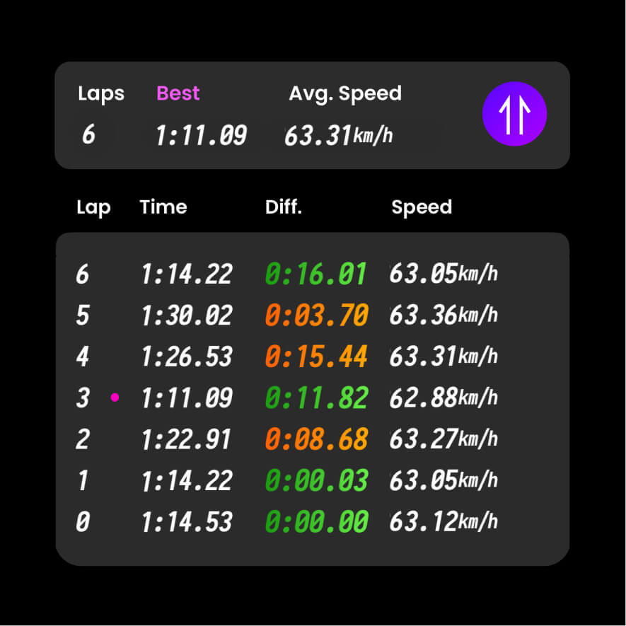 Position your start/finish line anywhere on the map, and let us detect every lap you complete. With no extra equipment needed, you can track your performance effortlessly as you race, all in real time.